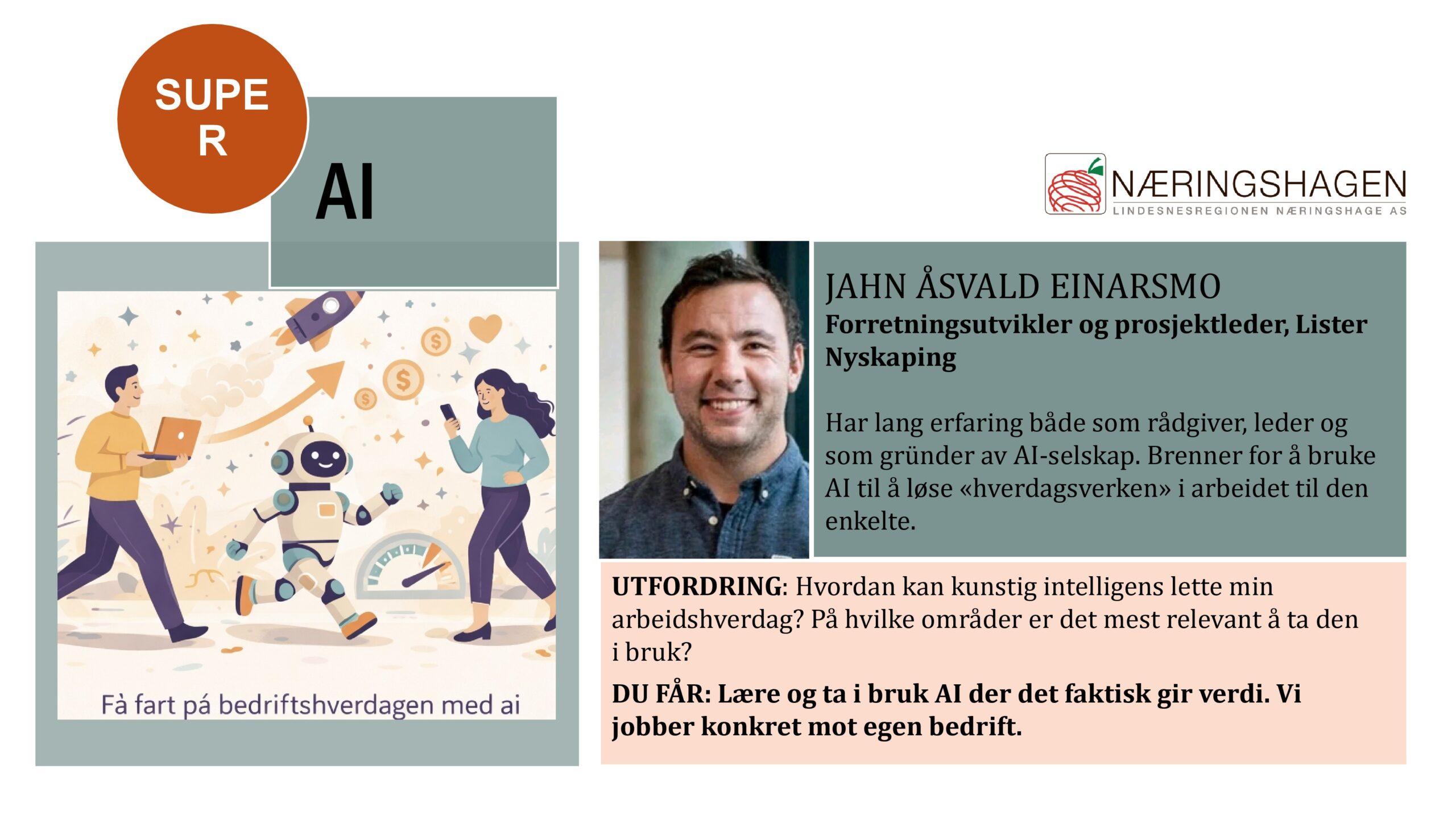 PROGRAM FOR SMB-er: FÅ FART PÅ BEDRIFTSHVERDAGEN MED AI TEMAMØTER PÅ 2-3 TIMER. KAN STILLE MED INNTIL TO FRA HVER…