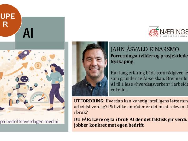 PROGRAM FOR SMB-er: FÅ FART PÅ BEDRIFTSHVERDAGEN MED AI TEMAMØTER PÅ 2-3 TIMER. KAN STILLE MED INNTIL TO FRA HVER BEDRIFT. SMÅ WORKSHOPS…